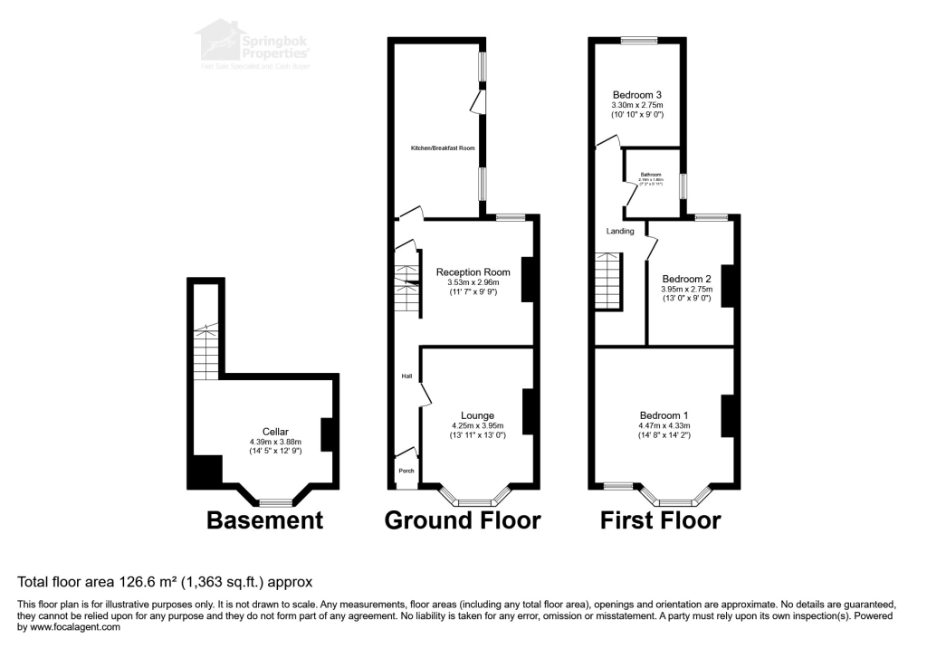 Upstairs, the first floor landing gives access to three bedrooms. The main bedroom sits at the front and benefits from a bay window, while two further bedrooms provide additional space suitable for family members, guests or workspace. The floor is completed by a family bathroom fitted with a bath, wash basin and WC.