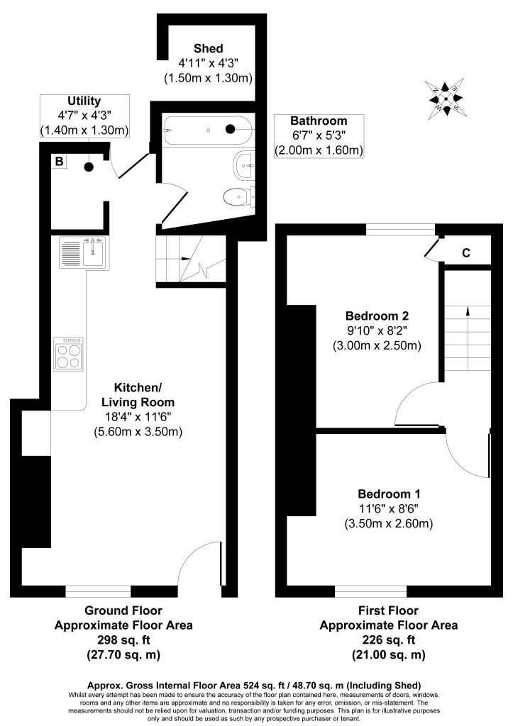 The ground floor centres around an open-plan kitchen and living space, creating a sociable main living area with plenty of scope for personalisation. A wood-burning style stove set within a fireplace recess adds character and a focal point to the room, while the kitchen area is fitted with modern base and wall units, work surfaces and integrated appliances. The room enjoys natural light from the front aspect and offers ample space for both seating and dining arrangements. From the rear of the room a door leads through to a useful utility area providing additional storage and laundry space, while beyond this is the bathroom fitted with a bath, shower over, wash basin and WC. Adjacent to the bathroom is a small external store or shed which offers practical space for tools, bikes or general storage.